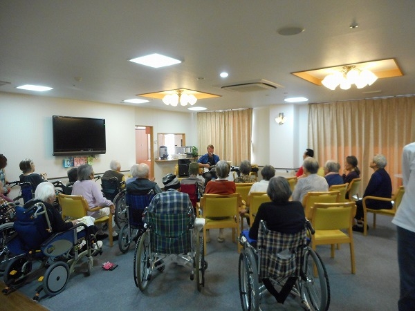10月30日(木) イオンモール倉敷の応援団長のマリオさんが演奏に来てくださいました。 歌もギターや三線の演奏もとても素晴らしく、選曲もばっちりでどの曲も入居者様の口ずさめる曲ばかりで大変良かったです。 入居者様は一緒に歌ったり、手拍子されたり、手や足でリズムに乗ったりして、中には涙、流されている方もいらっしゃったのが印象的でした。 曲と曲の合間のトークも面白かったです。 ぜひまた来て、皆さんを楽しませていただきたいです。
