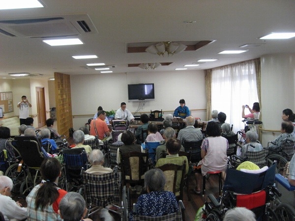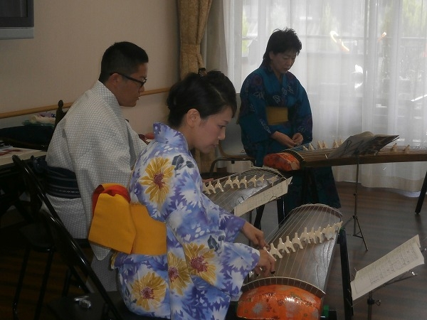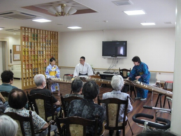 8月23日(土)、【倉敷ことみ会】の仲達泉先生、田中直子先生、川嶋和也様にボランティアとして、お琴の演奏会をして頂きました。以前からたくさんの入居者様からご希望があり、念願かなってやっと実現することができました。美空ひばりさんの【川の流れのように】や【ふるさと】など30分間の予定にしておりましだが、入居者様からの3回ものアンコールにより予定時間を大きくオーバーして約1時間の演奏会になりました。お琴の音色と入居者様の嬉しそうな笑顔で演奏会はあっという間に終了いたしました。倉敷ことみ会の皆様本当にありがとうございました。次回またよろしくお願いいたします。