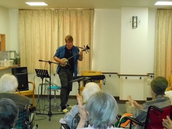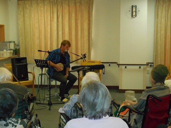 10月30日(木) イオンモール倉敷の応援団長のマリオさんが演奏に来てくださいました。 歌もギターや三線の演奏もとても素晴らしく、選曲もばっちりでどの曲も入居者様の口ずさめる曲ばかりで大変良かったです。 入居者様は一緒に歌ったり、手拍子されたり、手や足でリズムに乗ったりして、中には涙、流されている方もいらっしゃったのが印象的でした。 曲と曲の合間のトークも面白かったです。 ぜひまた来て、皆さんを楽しませていただきたいです。