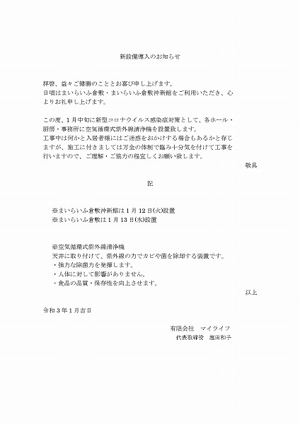 この度、1月中旬に新型コロナウイルス感染症対策として、各ホール・厨房・事務所に空気循環式紫外線清浄機を設置致します。